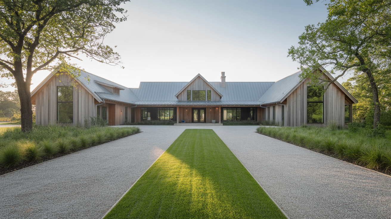 A center grass strip adds visual softness, creating an inviting approach that feels established rather than utilitarian.