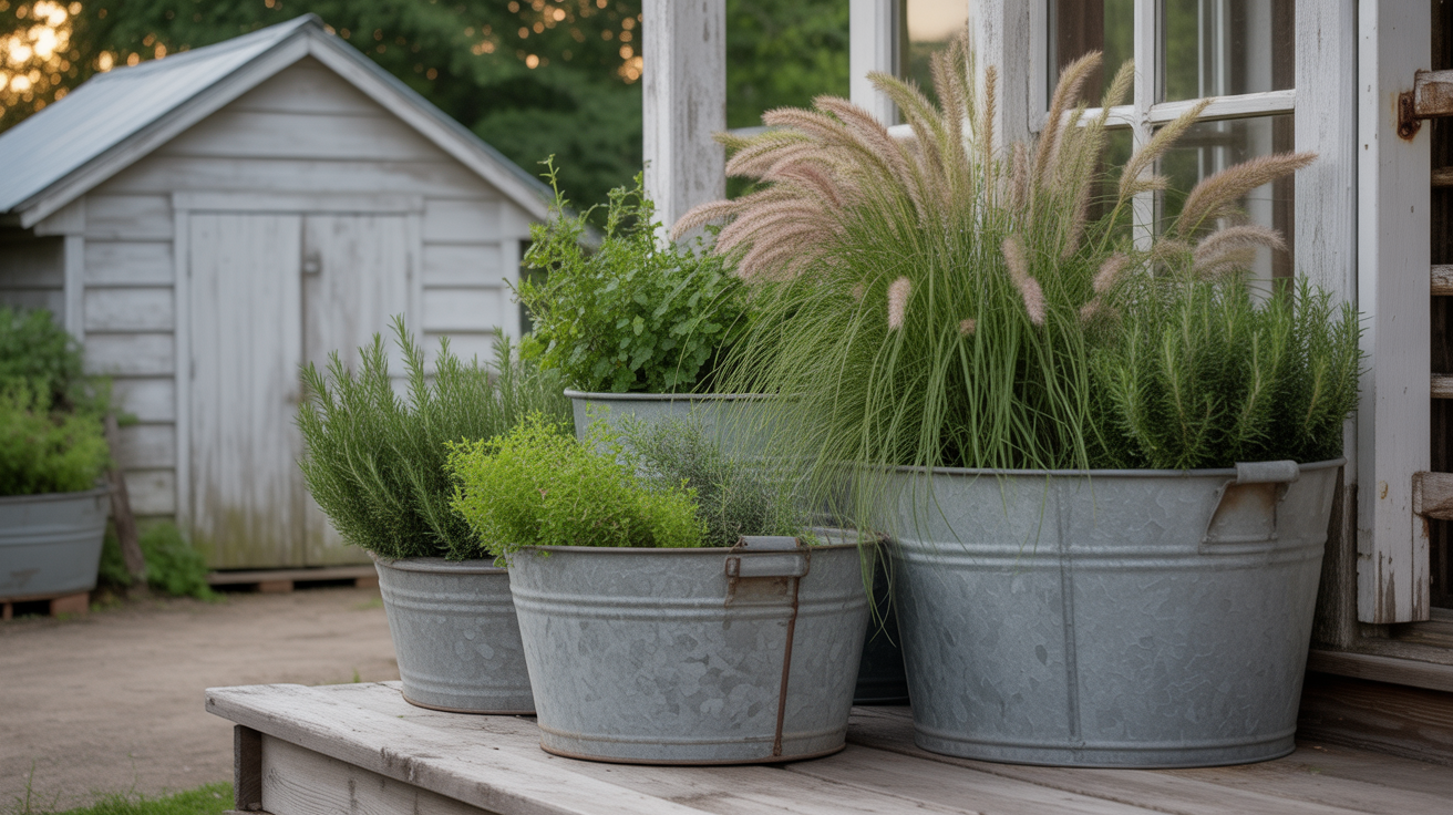 Vintage galvanized tubs bring authentic farm history to gardens. Their weathered metal surfaces add industrial texture while providing excellent root depth—drill drainage holes before filling with soil.