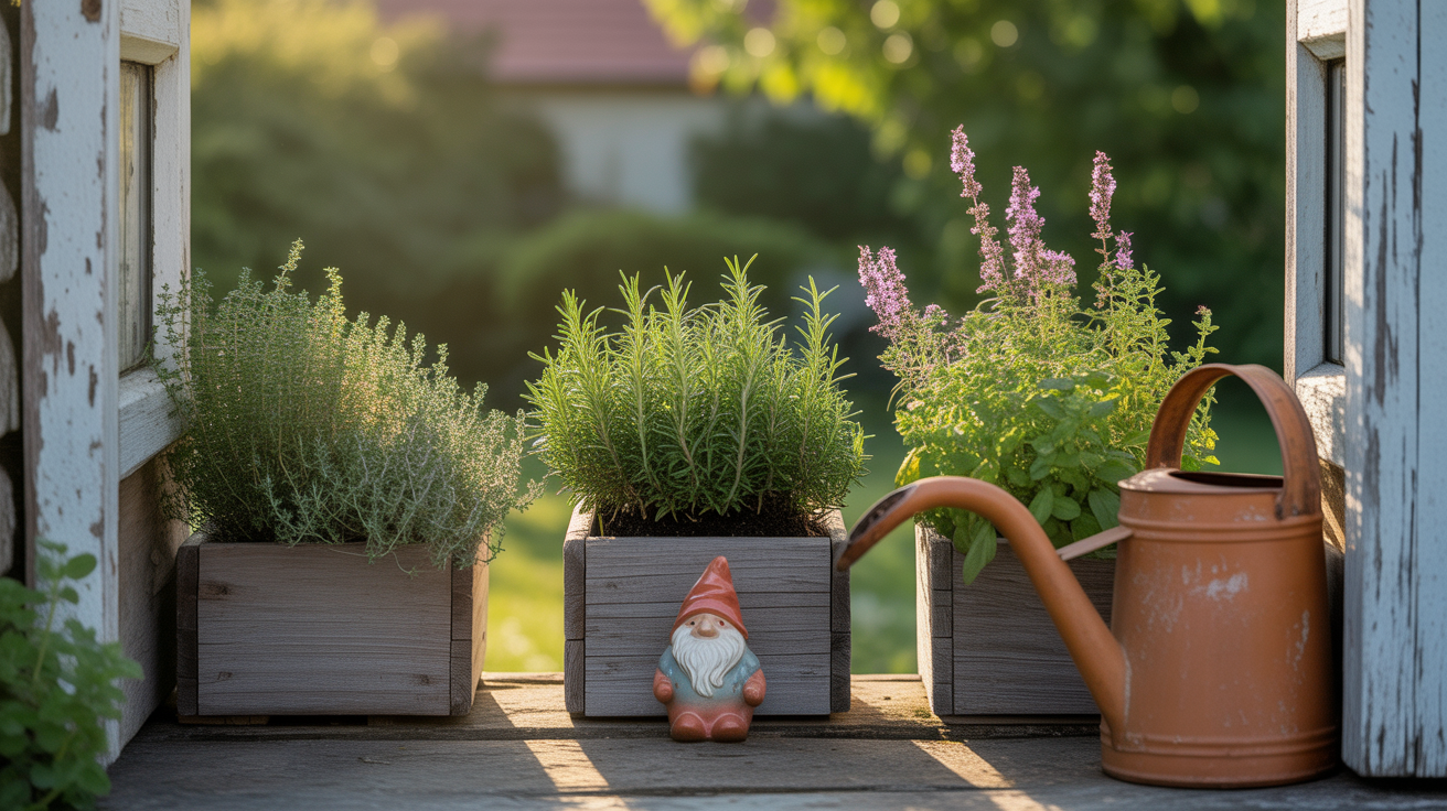 A compact herb garden near the kitchen blends practicality with farmhouse tradition. Arrange by height with taller rosemary behind shorter thyme. Plant geometric patterns within defined beds, add gravel paths for easy harvesting, and rustic appeal.