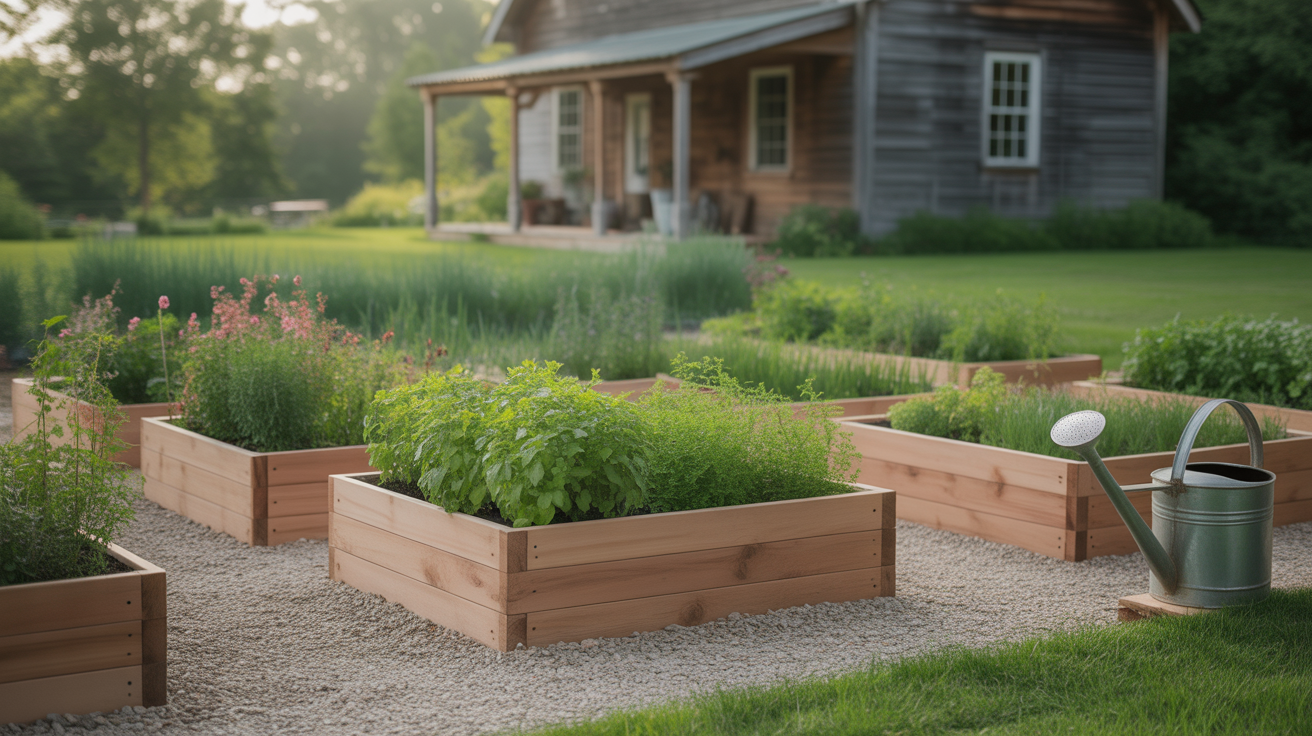 Elevated beds made from cedar or cypress create practical growing spaces with farmhouse character. Their structured form adds architectural interest while improving drainage and accessibility.