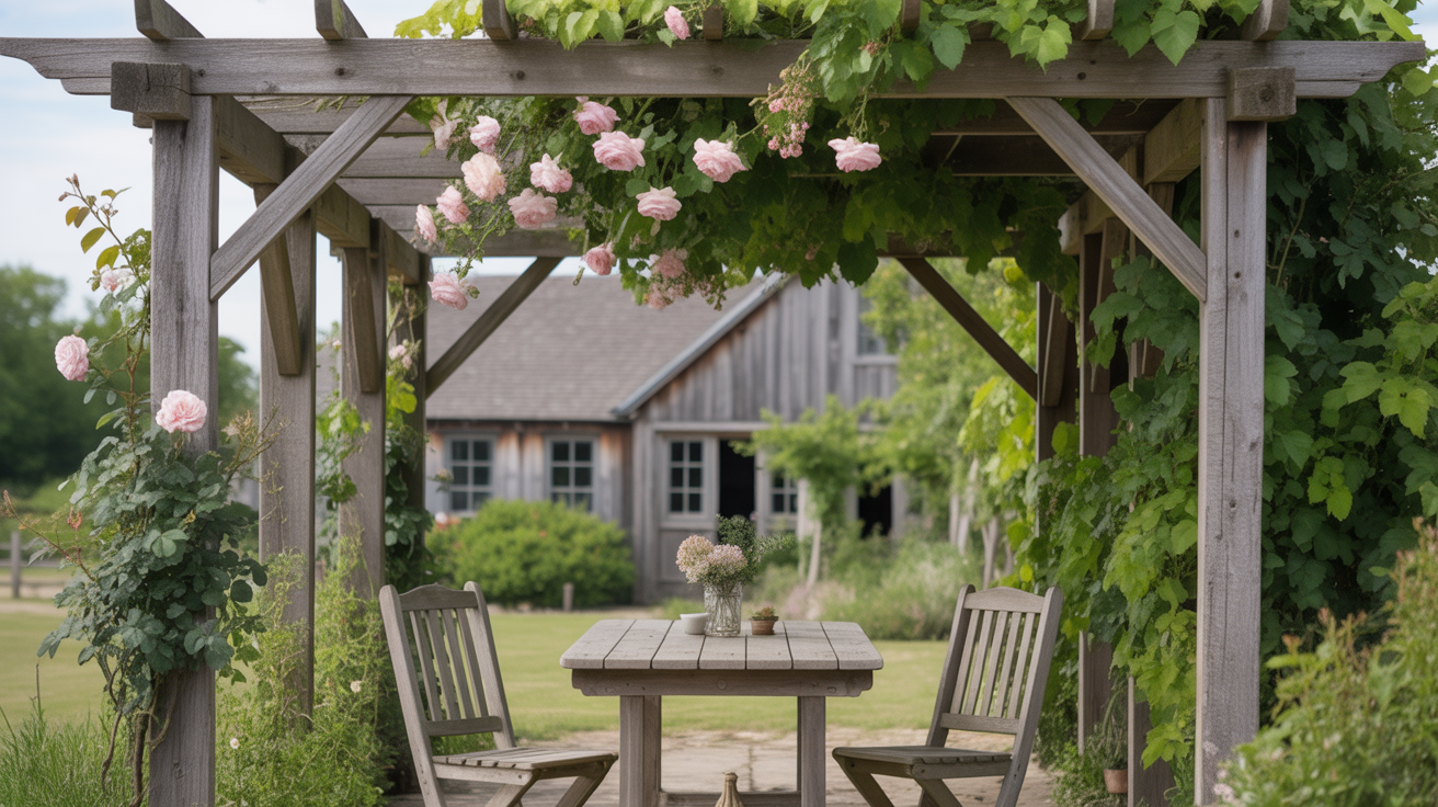 A pergola from weathered timbers creates architectural definition for outdoor areas. The overhead structure frames views while filtering sunlight.