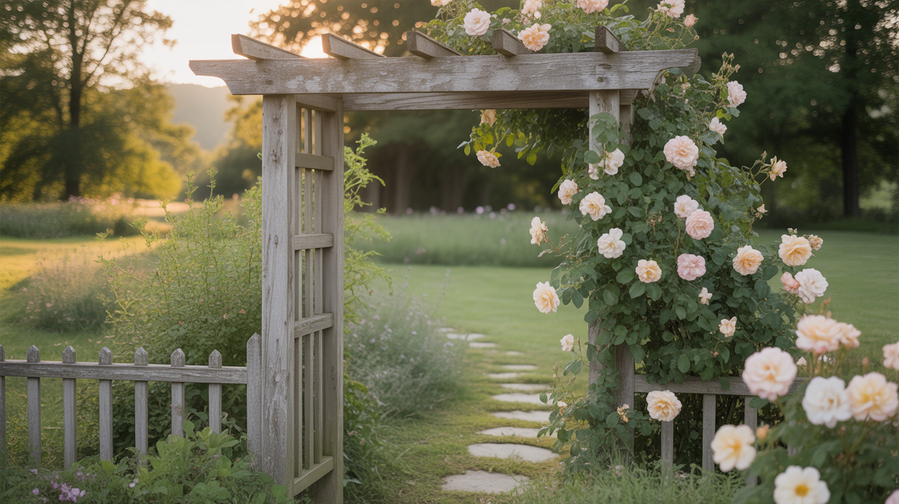 A simple wooden arbor marks transitions between spaces while supporting climbing plants. This architectural element creates a momentary pause in your landscape journey.