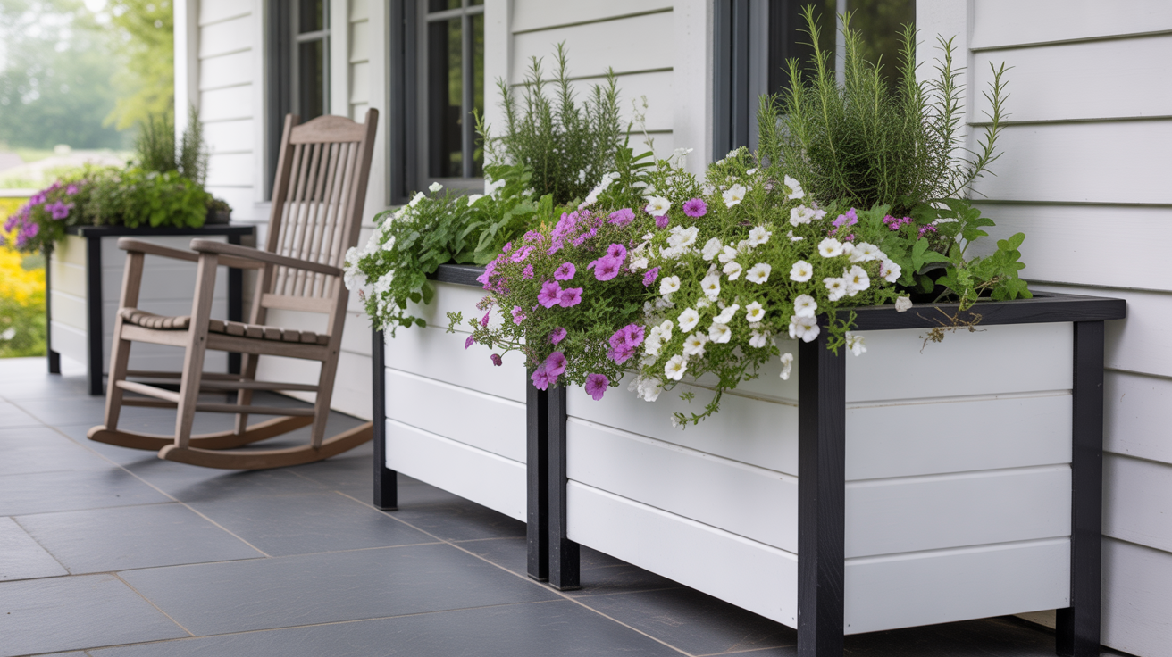 Crisp, white planters with contrasting black trim instantly convey a modern farmhouse style. These graphic containers provide clean architectural lines while colorful plantings take center stage.
