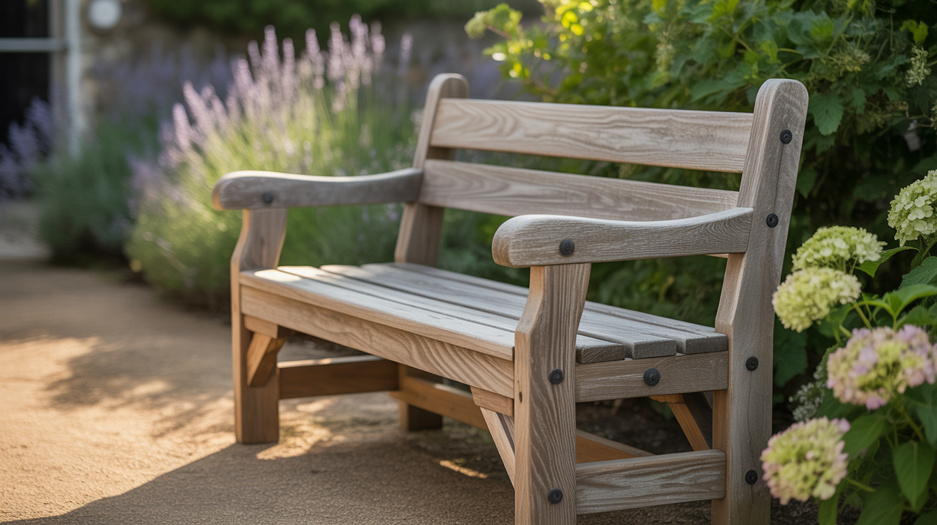A timber bench with black metal brackets offers practical seating with a farmhouse character, perfect for garden nooks or along pathways as inviting rest spots. Choose chunky, weathered wood that ages gracefully.