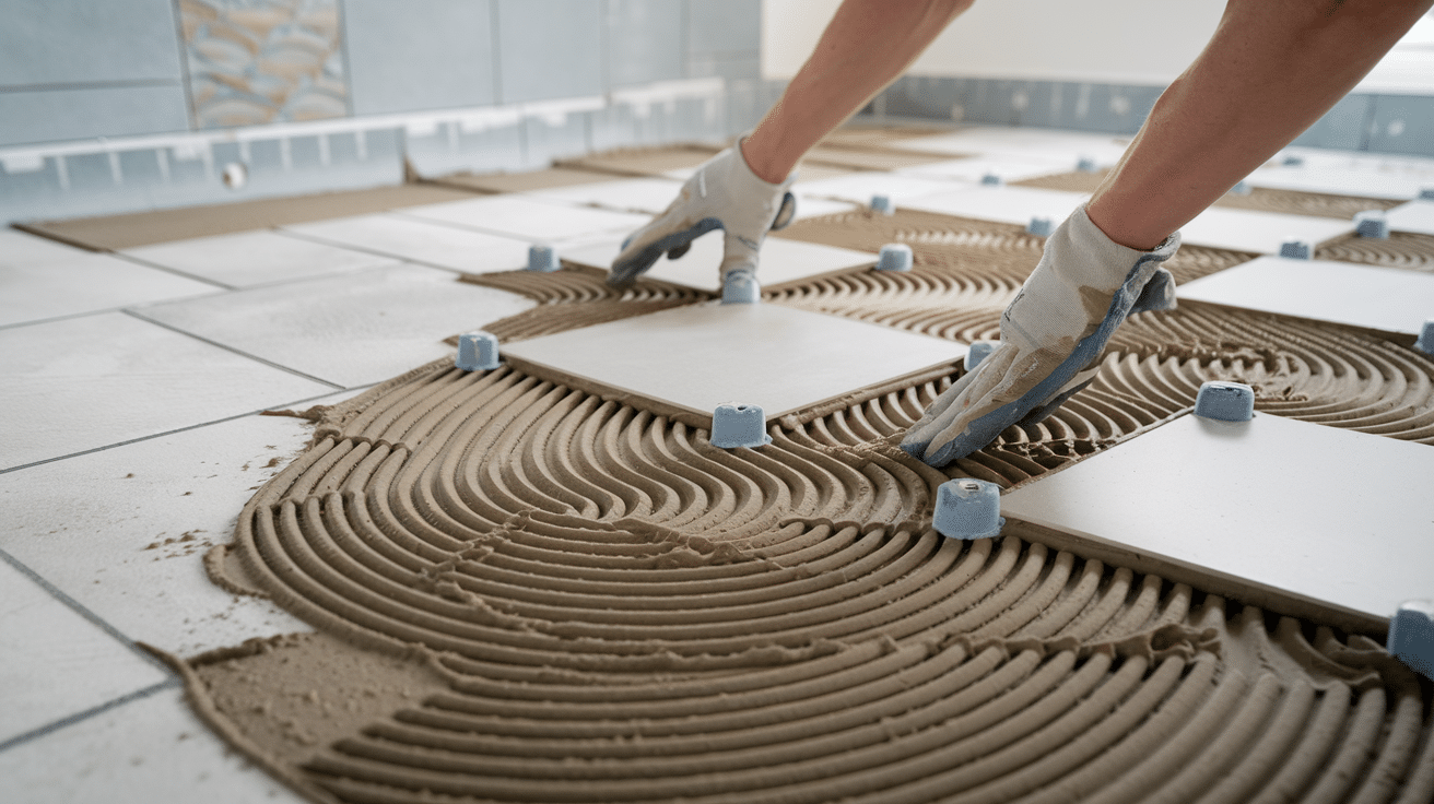 Plan your tile layout carefully before mixing the adhesive. Place tiles precisely, using spacers for even gaps.