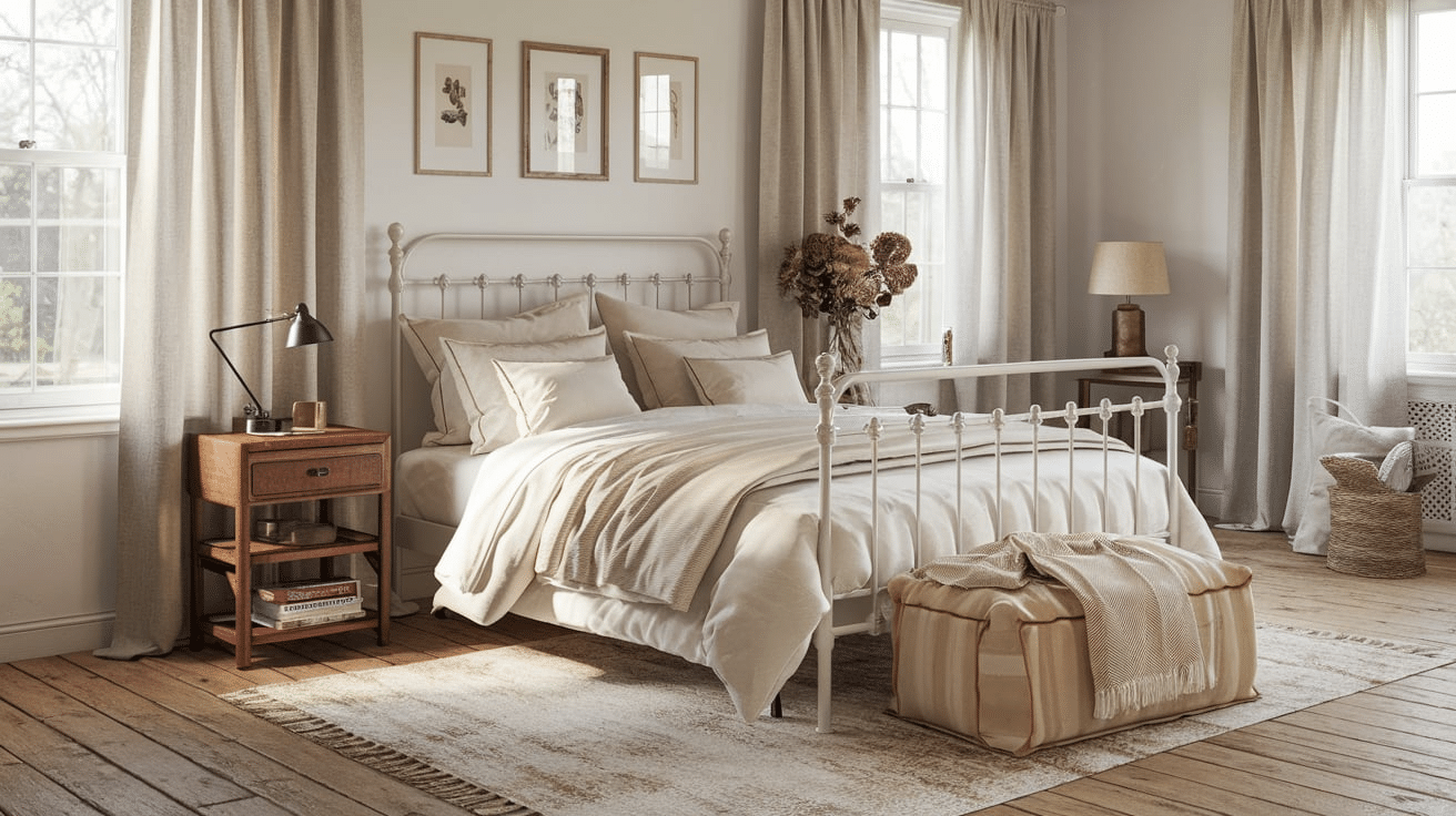 Start with a metal bed frame or wooden headboard. Keep bedding in light tones like white or soft cream, adding a wool or cotton blanket for cooler nights.