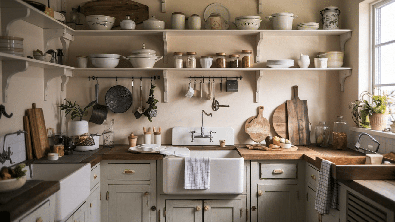 The kitchen can reflect farmhouse vintage style through both fixed features and smaller details.