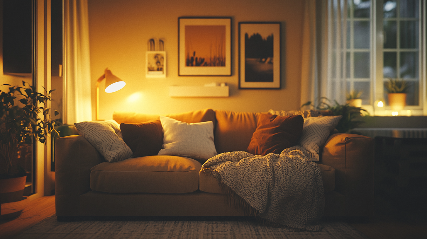 Choose a warm colour palette with soft neutrals and rich, comforting tones that make the room feel like a gentle embrace. Layer throw pillows and blankets to add texture and instant warmth.