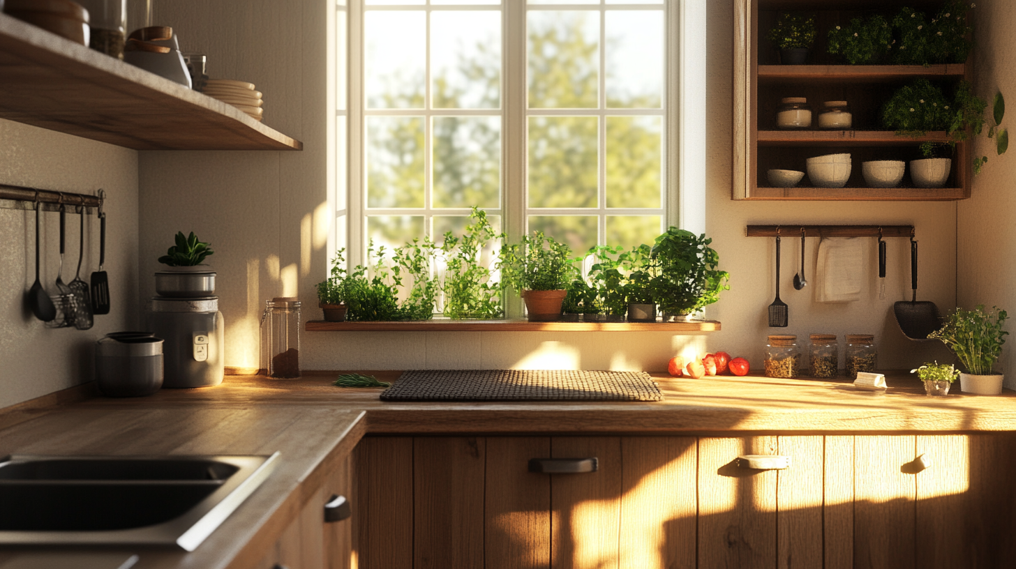 Place a small herb garden near the window to add life and natural fragrance. Add soft, cushioned mats in front of the sink or stove to make cooking more comfortable.
