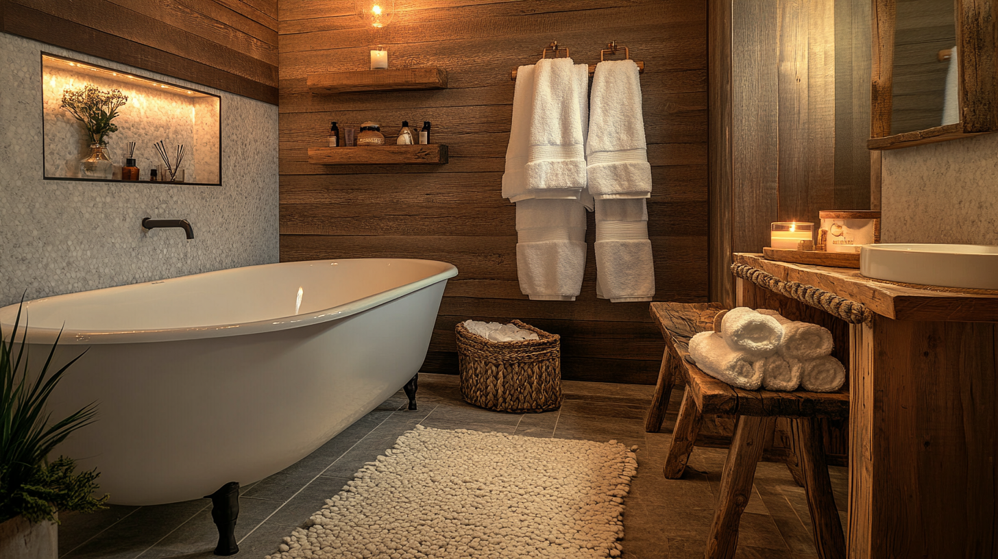 Invest in plush, soft towels in warm, rich colours. Add warm-toned accent pieces like wooden bath mats or terracotta plant holders.