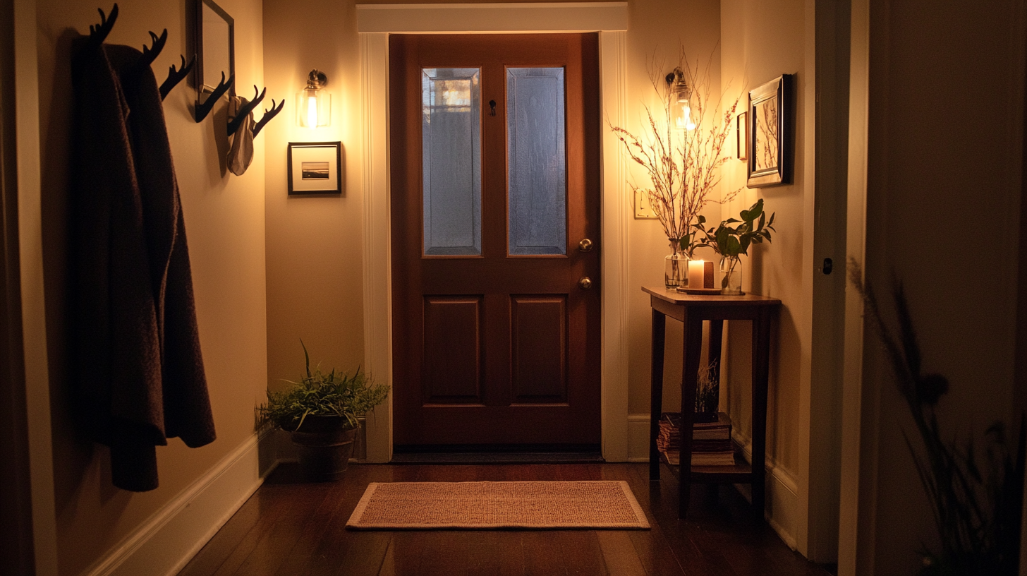 Install a warm-toned lamp to create soft lighting. Add functional yet stylish coat hooks and a small table with a subtle, comforting scent diffuser.