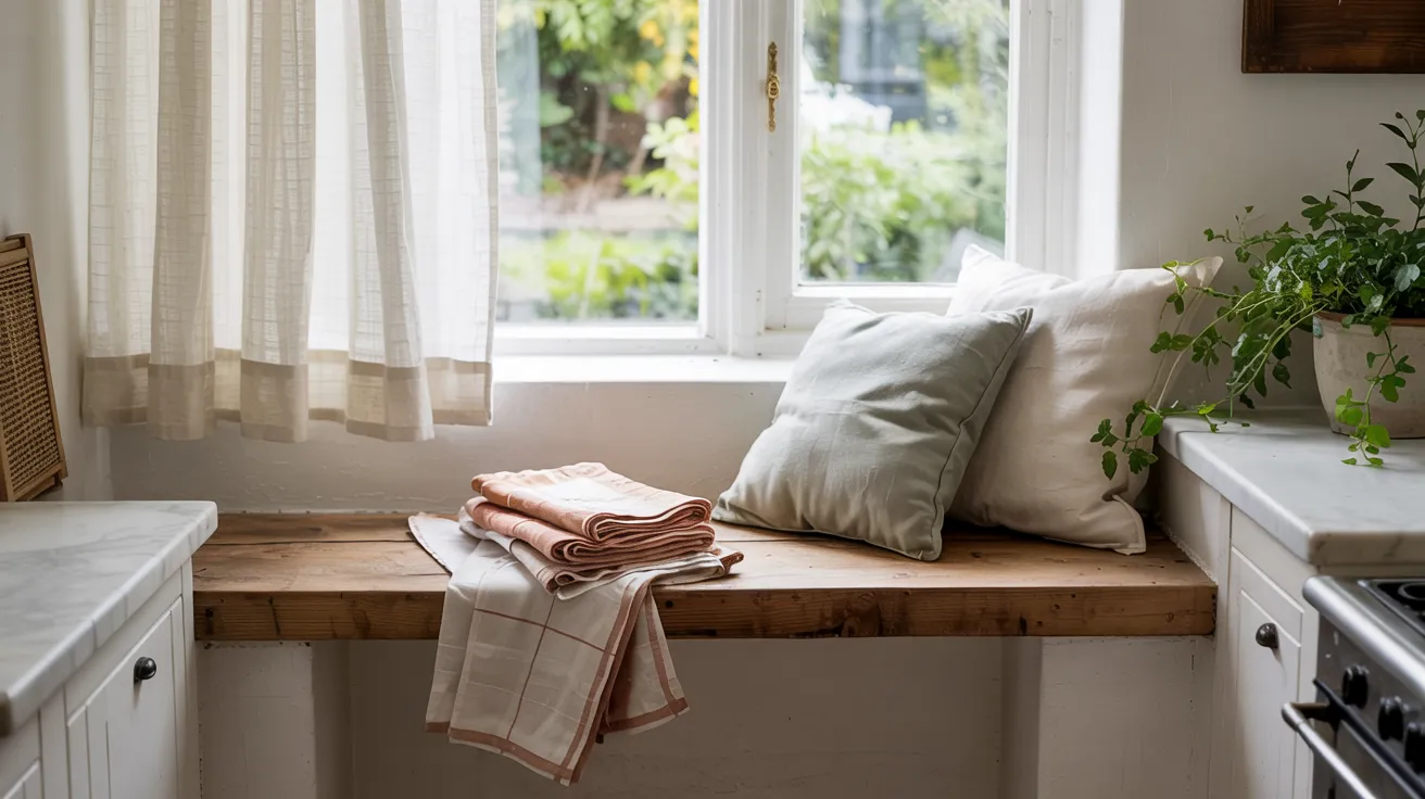 Simple linen cafe curtains filter light beautifully while adding softness. Replace harsh hand towels with Turkish cotton versions in terracotta or mustard.