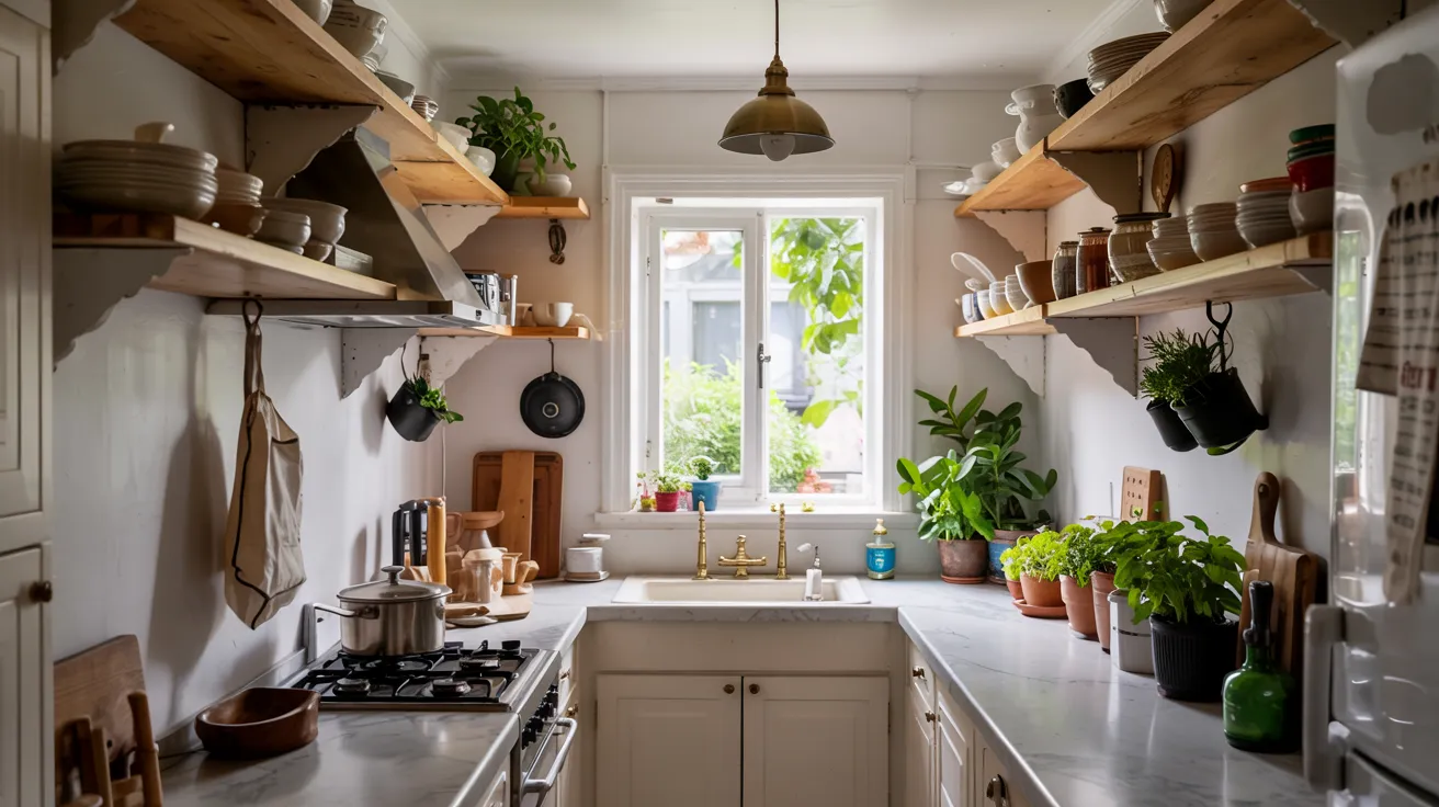 Mount floating wooden shelves for practical storage and visual warmth. Use a single wall for a colour accent or textured backsplash.