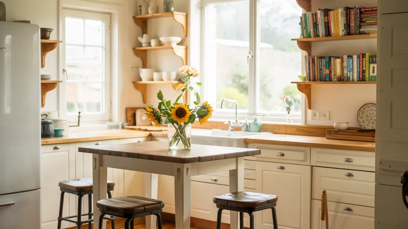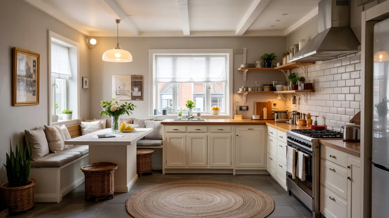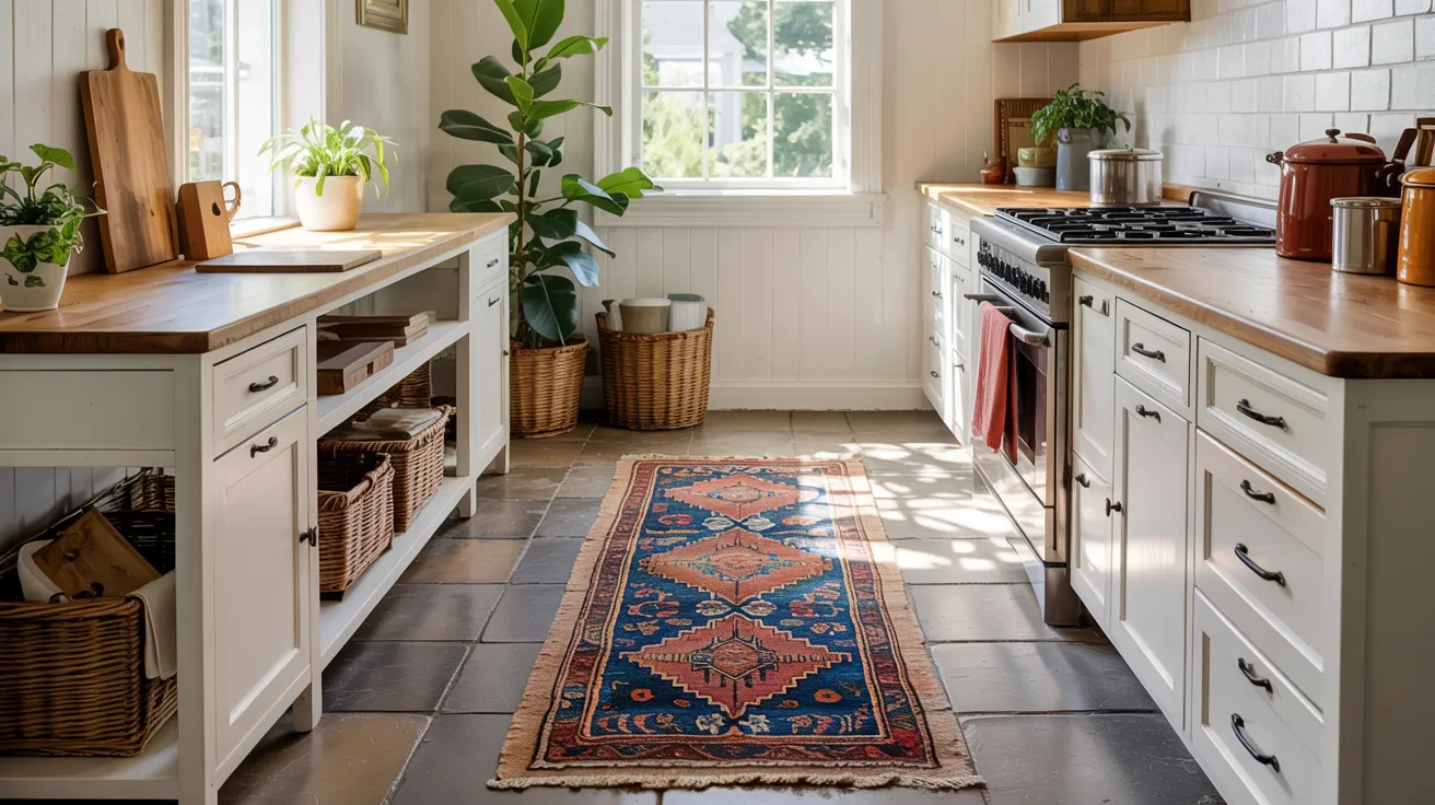 Vintage-inspired patterns in faded blues or rust tones add character without overwhelming. Jute or sisal runners provide a natural texture while hiding crumbs between cleanings.