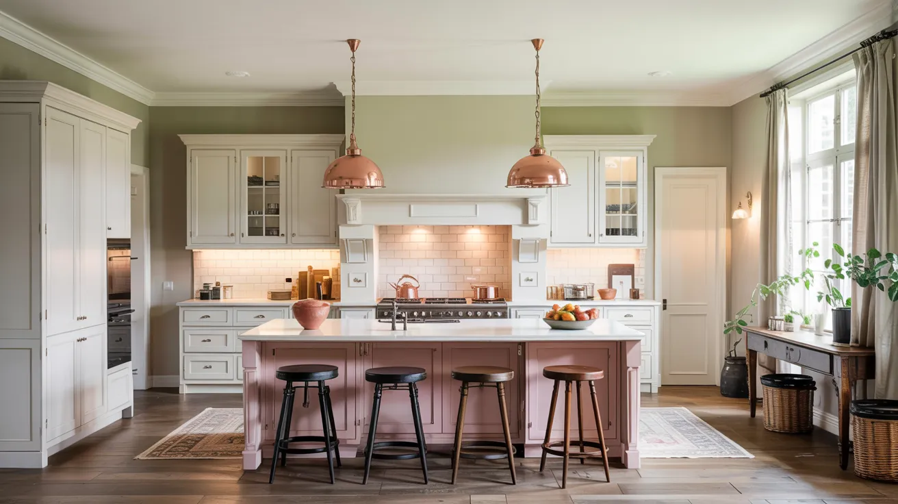 Consider warm white with yellow undertones for walls to soften bright cabinet whites. Paint just the island in a muted blush for subtle contrast that still feels cohesive.