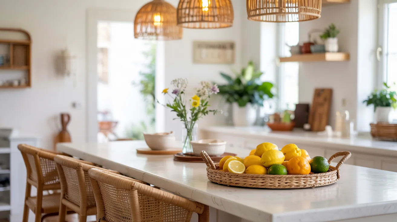 Backless rattan barstools tuck neatly under counters. Woven trays corral items on countertops while adding visual warmth.
