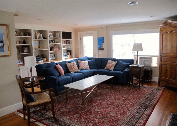 These rugs add a sophisticated touch and complement the blue velvet sofa, emanating the vibes of elegance. So, pick rugs that are solid neutral, in neutral patterns, or neutral with an artistic touch. These rugs also go well if your living room is in the minimalistic style, simple theme, or Scandevidian theme.
