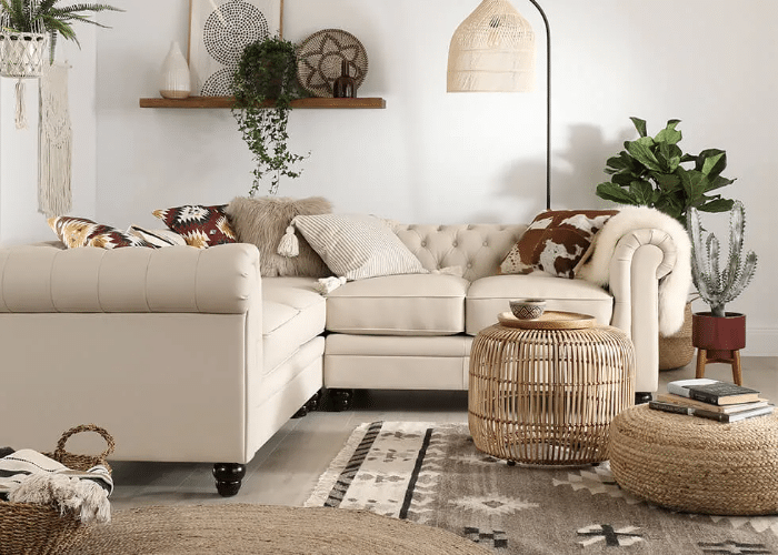 The use of natural materials in an organic modern living room plays an immensely important role. The hint of nature at every step establishes a harmonious connection between serenity and style. Ensure to infuse materials such as wood, stones, jute, cotton, and wool. Accessories like handwoven bamboo baskets, hand-crafted ceramic bowls, and pots encapsulate the essence of nature’s modern lifestyle rooted in the simplicity of nature.