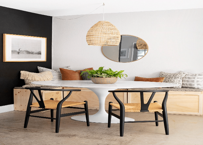 A color that is making its way to Scandinavian interior design is peach. This warm peach color makes for a soft and cozy ambiance. If strategically placed in different parts of your dining room, it can welcome a lot of warmth and lift the vibes of the surroundings. It is a perfect color for summer, fall, and winter. In your dining space, peach color can play a very important role in making your space more welcoming and inviting.