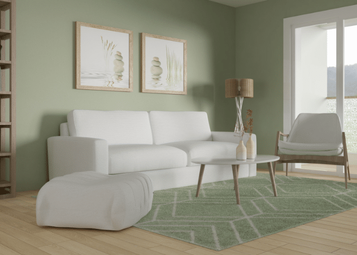 The color sage green is closely linked to nature. Therefore, it goes well with natural materials. Floors made of wood, porous stone, glazed ceramics, curtains, and sofas with velvet and linen upholstery are the ideal choice to decorate a room colored with a shade of sage green.