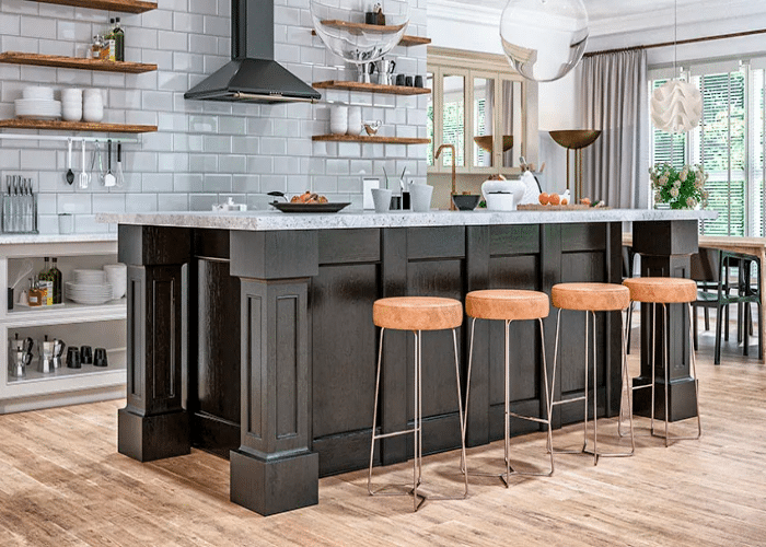 Place bar stools against the kitchen counter or kitchen island to create a consistent and connected room. This concept will serve as a midpoint between the kitchen and the living room, amalgamating the two. This will show a gradual transition from work to leisure. It will also add extra seats in the room.