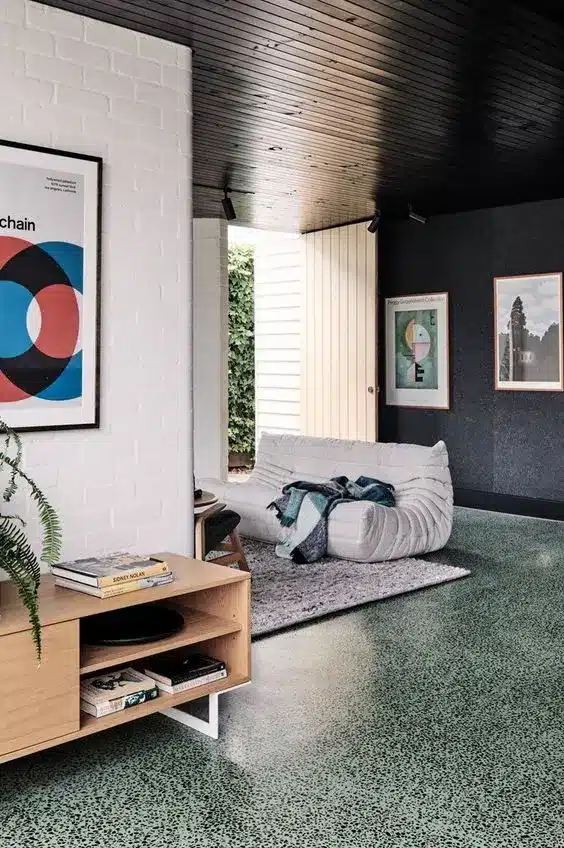This flooring option adds the best order of color and pattern to your setup, making it a playful contrast with black walls.