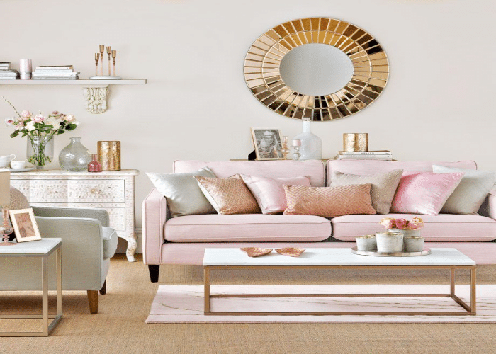 Styling a pink couch in the living room along with some golden metallic accessories such as a golden clock, lamps, motifs, metallic light fixtures, and golden frames on the wall will give an elegant and glam look to the living room.