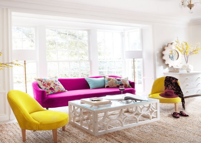 This will give the living room a vibrant look. Both the colors are cheerful, and the best pairing for a vibrant-looking living room would be bright/hot pink with vivid orange shades.