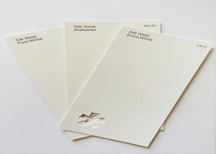 Sherwin Williams’ Pure white is a versatile color, just like alabaster, and has a slight yellow undertone, which makes it look not too stark. Pure white is the best option for trims.