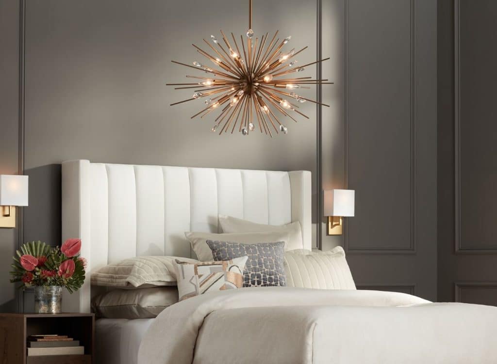 If you have a relatively larger bedroom with a tall ceiling, a chandelier will most certainly enhance the aesthetics of your room more than anything else.