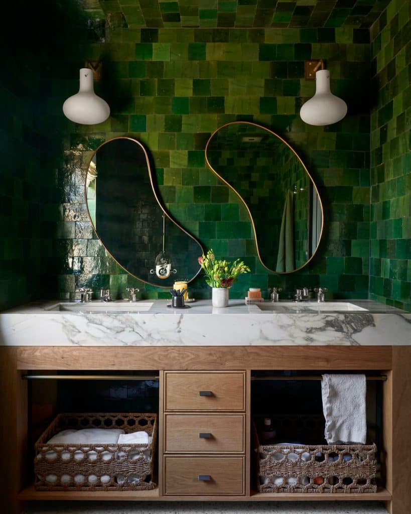 With unconventional wallpaper or colored sinks, present a pleasant surprise the next time you host.