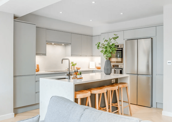 Understanding the modern kitchen is simple, and you can easily view the vibe and its sleek finish. The designs are always bold and more engaging with built-in appliances, more often designed with contrast patterns for their features. The features are designed to have a minimal fuss, so the cabinets are minimalistic and, most of the time, handleless.