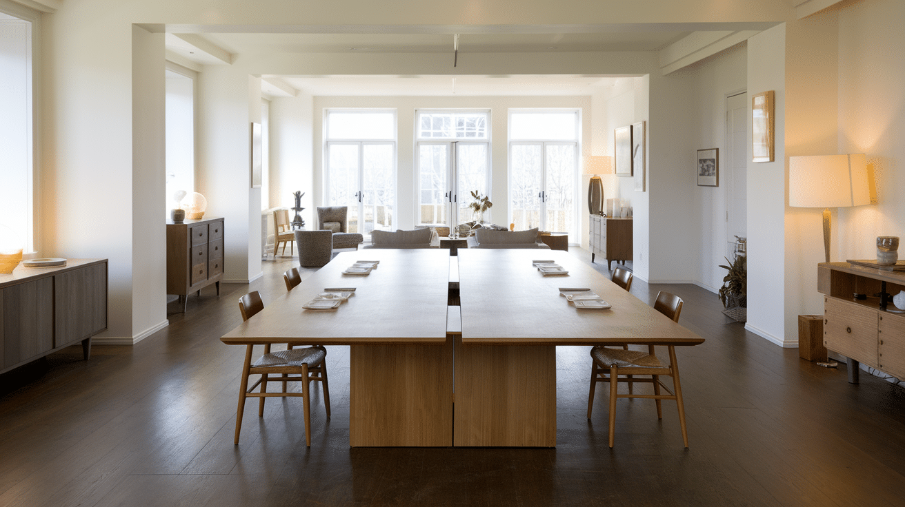 A table that’s too wide can make the space feel cramped and harder to move around, while a long, narrow table can help maintain balance.