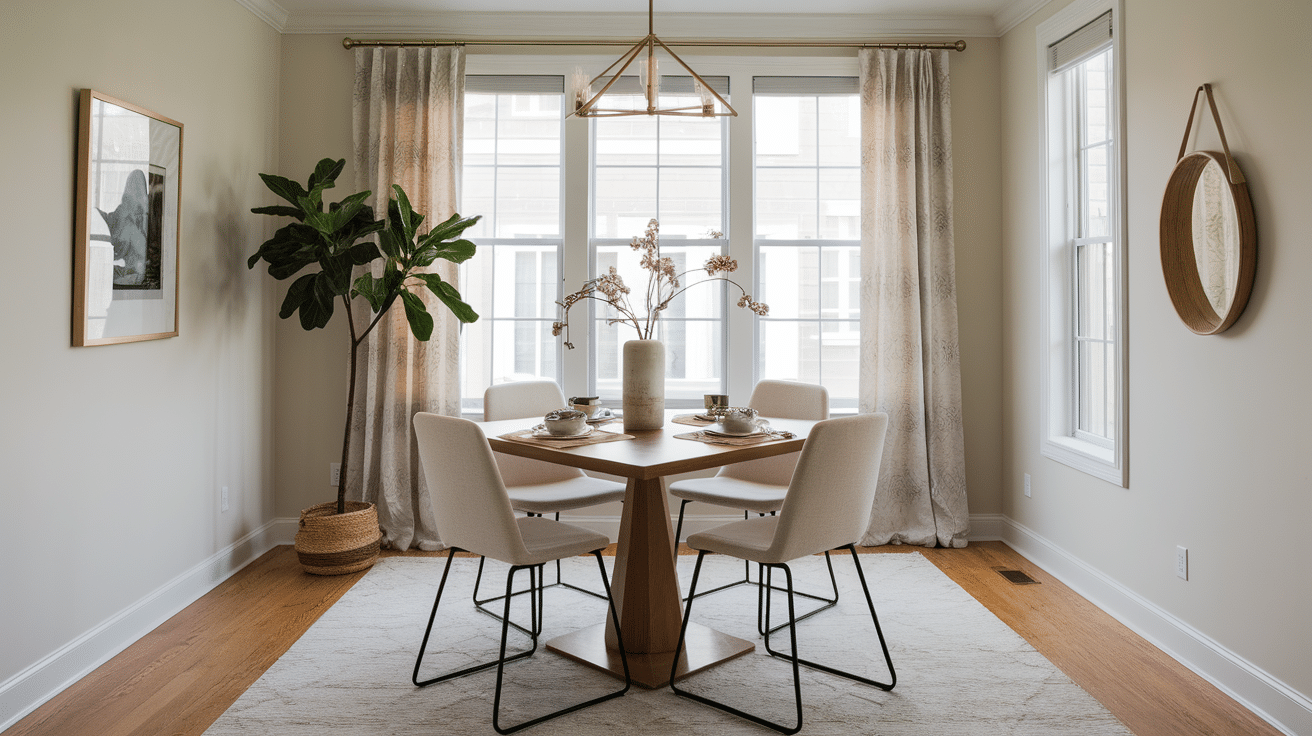 A square table, measuring about 36 to 48 inches on each side, can help make the space feel more balanced without crowding the room.