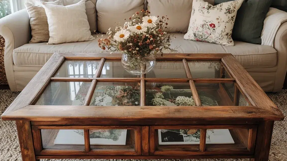 Turn an old window into a table by adding legs and a strong back panel underneath. The glass top can show off photos, dried flowers, or fun paper prints.