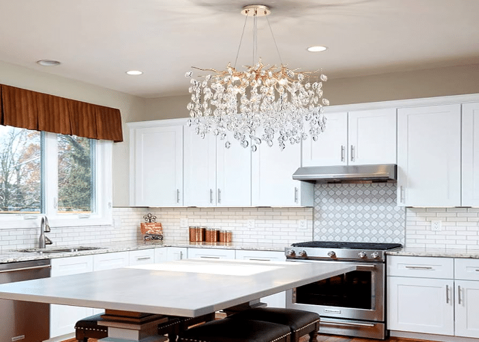 A chandelier in your kitchen can work wonders when it comes to adding to its luxury. You can hang it on top of a counter or in a corner to make your kitchen seem bigger and extra brighter at night. Such an accessory can transform your simple cooking space into a formal space.