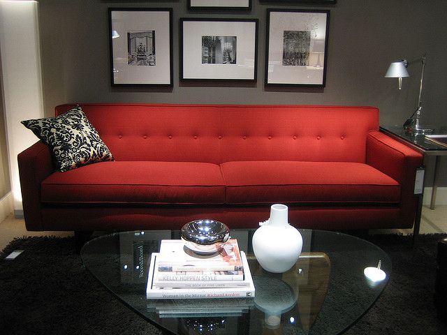 You can also try contrasting colors or monochromic shades for your living room. It perfectly sets up the atmosphere for your red sofa.