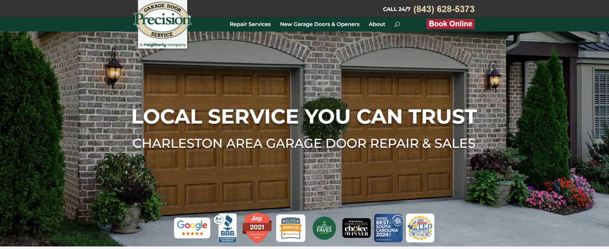 Precision Garage Door® of Charleston is a local franchise with the resources of a national network, including a highly trained service team. It installs a range of styles from several major manufacturers and emphasizes convenience with quick scheduling and weekend service. The company’s main feature is a web-based design tool that lets homeowners visualize a new door design on a photo of their home.