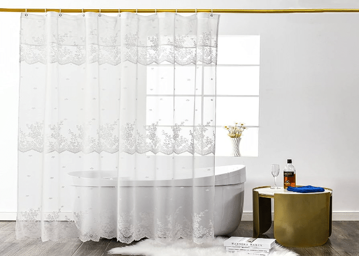 Lace can be used in the bathroom as window curtains, shower curtains, and more.