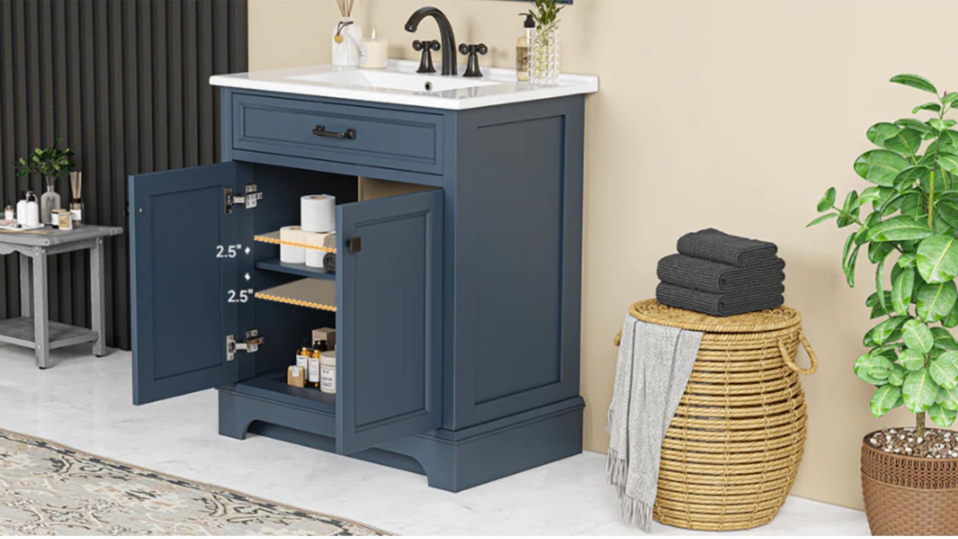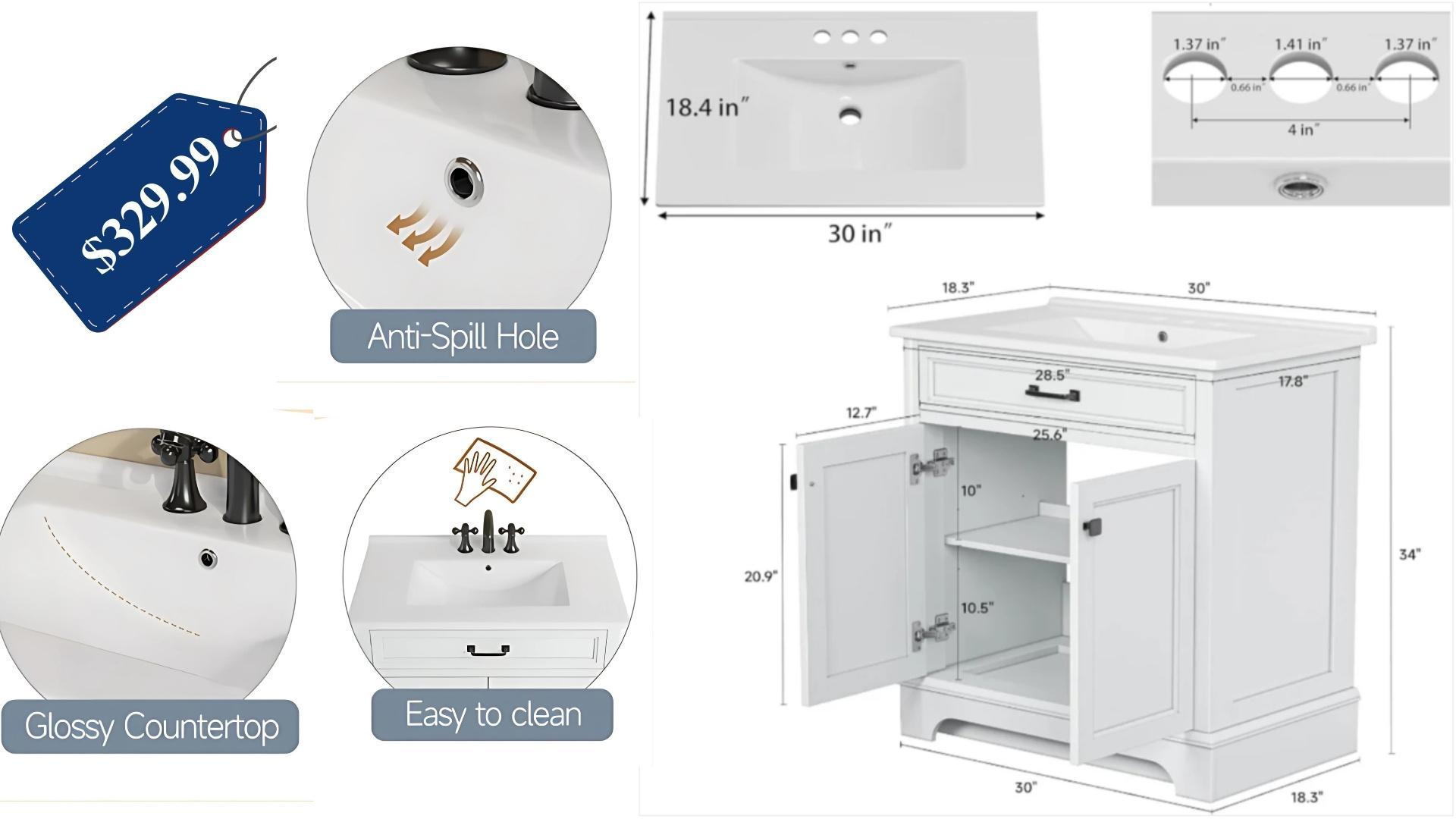 3. Hassle-Free Sink & Setup: This sink is made of stain-resistant ceramic and is easy to install with a pre-drilled faucet hole and included hardware. The guide that comes with the product makes assembling the vanity easy.