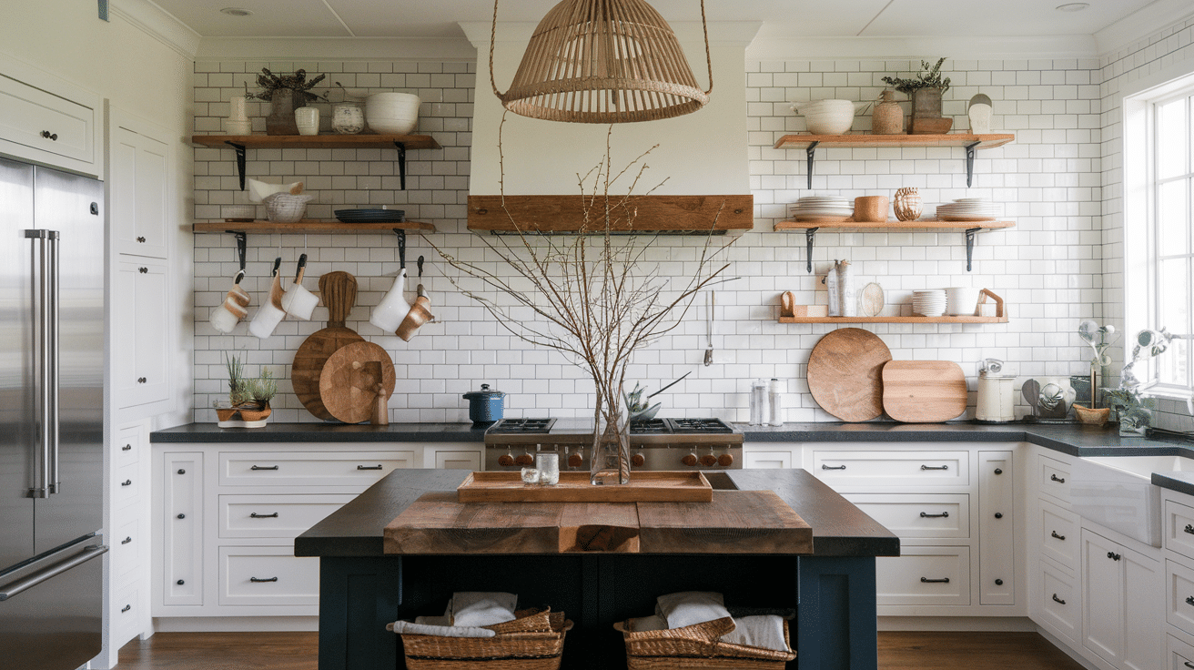 Try displaying wooden cutting boards and utensils on open shelves or counters.