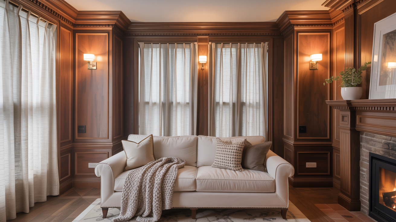 Lighting can completely transform wood paneling’s appearance. Wall sconces create dramatic shadows and highlight wood grain. LED strips work great for soft, indirect illumination.