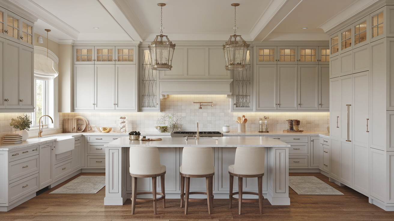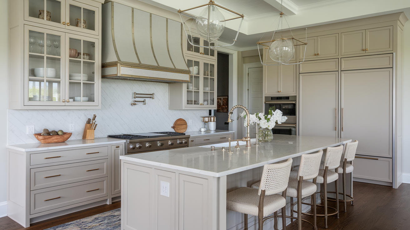 White quartz or marble counters add a clean look. Glass cabinet doors and mixed metals like brass and chrome add interest. The grey-white base lets you change small items as trends shift without redoing the whole kitchen.