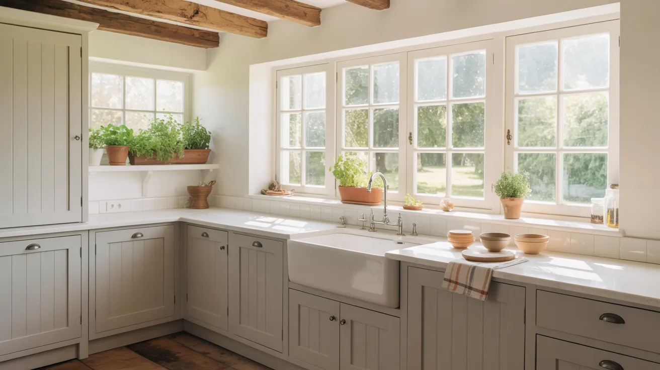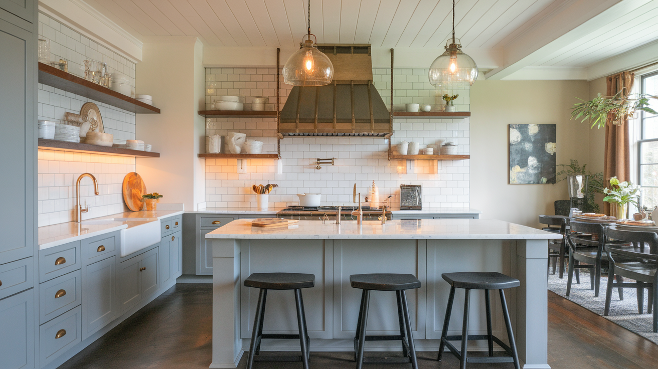 In farmhouse kitchens, grey cabinets with white counters bring a fresh take on country charm. Shaker-style grey cabinets add texture while white counters keep things bright. This style often includes open shelves and a big sink.